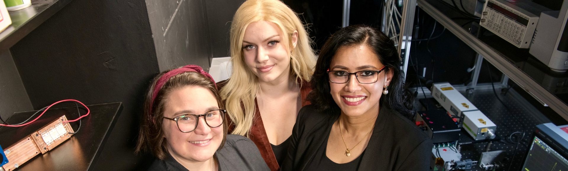 Caption:From l-r Dr Bethan Ford, Sophia Long, Dr Juna SathianThanks to this grant, Dr Sathian and her colleagues have been able to explore the use of LEDs to create an affordable, energy efficient alternative, which could be used in quantum technologies, deep-space communications, and portable sensing devices.